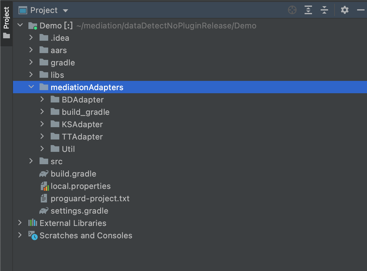 将Demo工程中 mediationAdapters 文件夹直接复制到开发者项目工程中,在setting.gradle中配置模块声明,同时在build.gradle配置源码依赖,并按照步骤 1 中配置的自定义类名将开发者项目工程中对应的类进行修改;