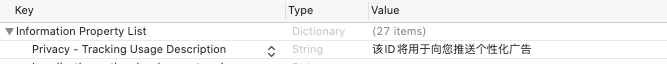 如果想在流量中显示 App Tracking Transparency 授权来获取IDFA等广告标识符,需要在Info.plist中添加NSUserTrackingUsageDescription,描述获取IDFA等广告标识符的用途。例如: