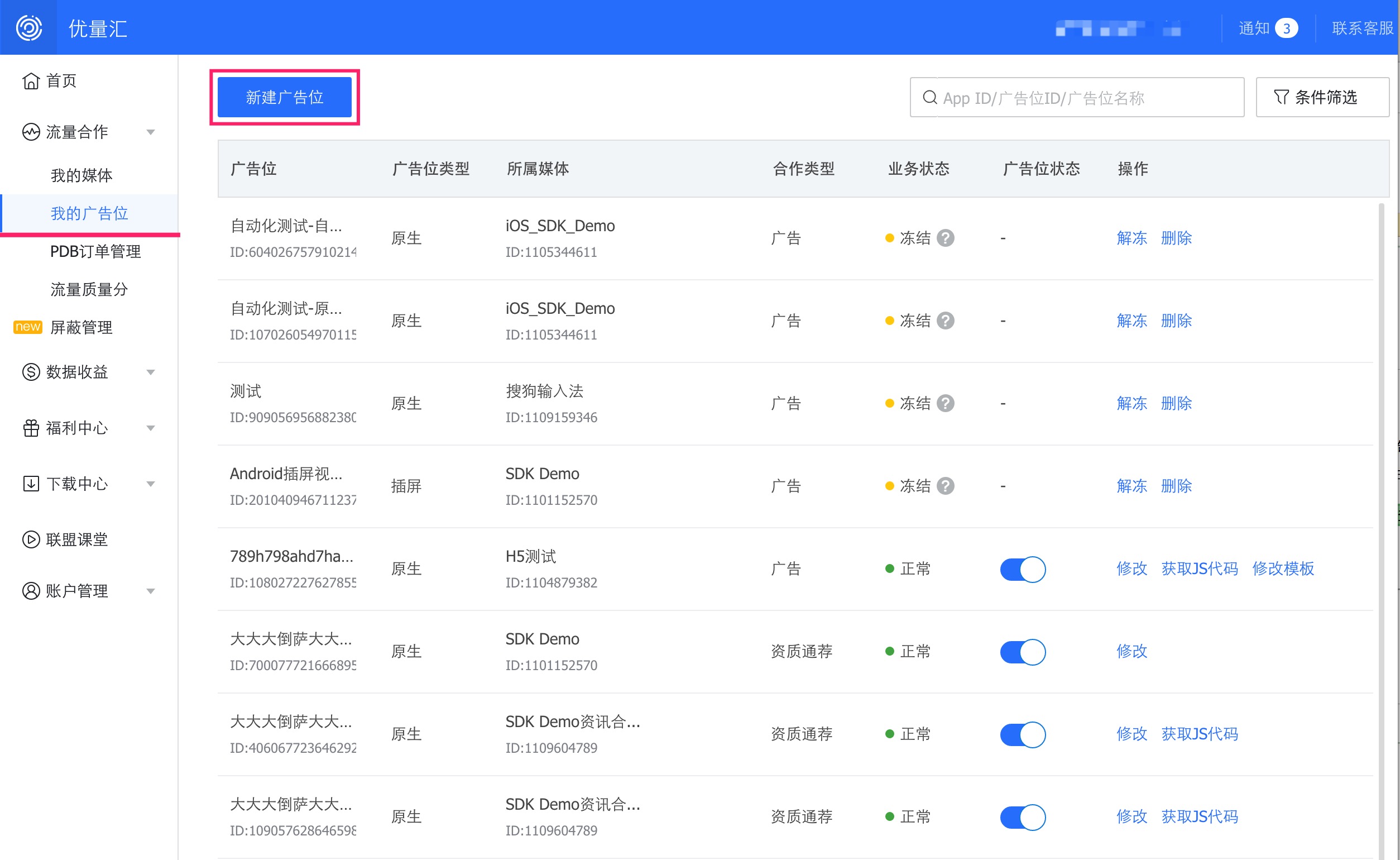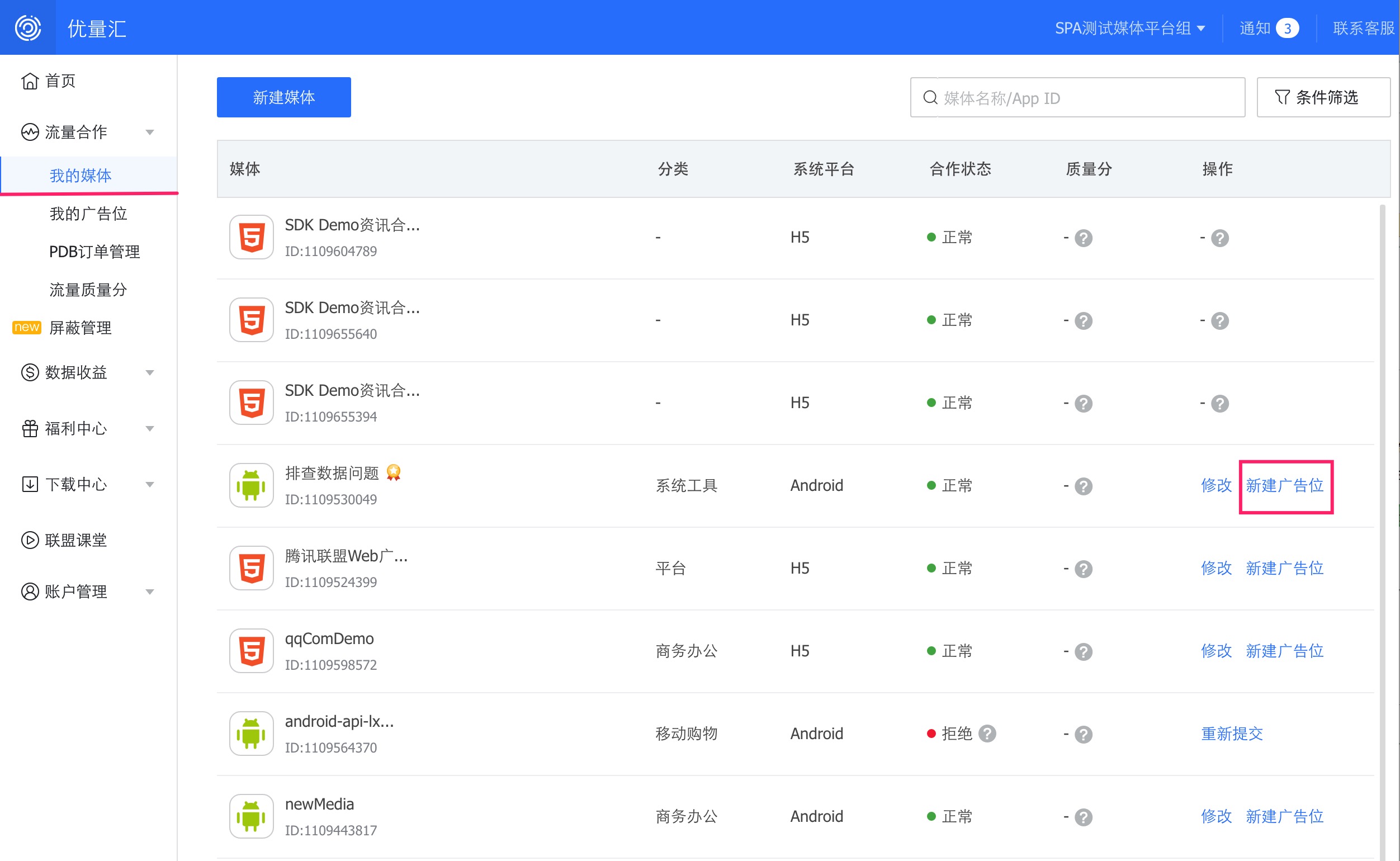 - 通过 流量合作 => 我的广告位 点击新建广告位,进入新建页面,选择对应的媒体完成创建