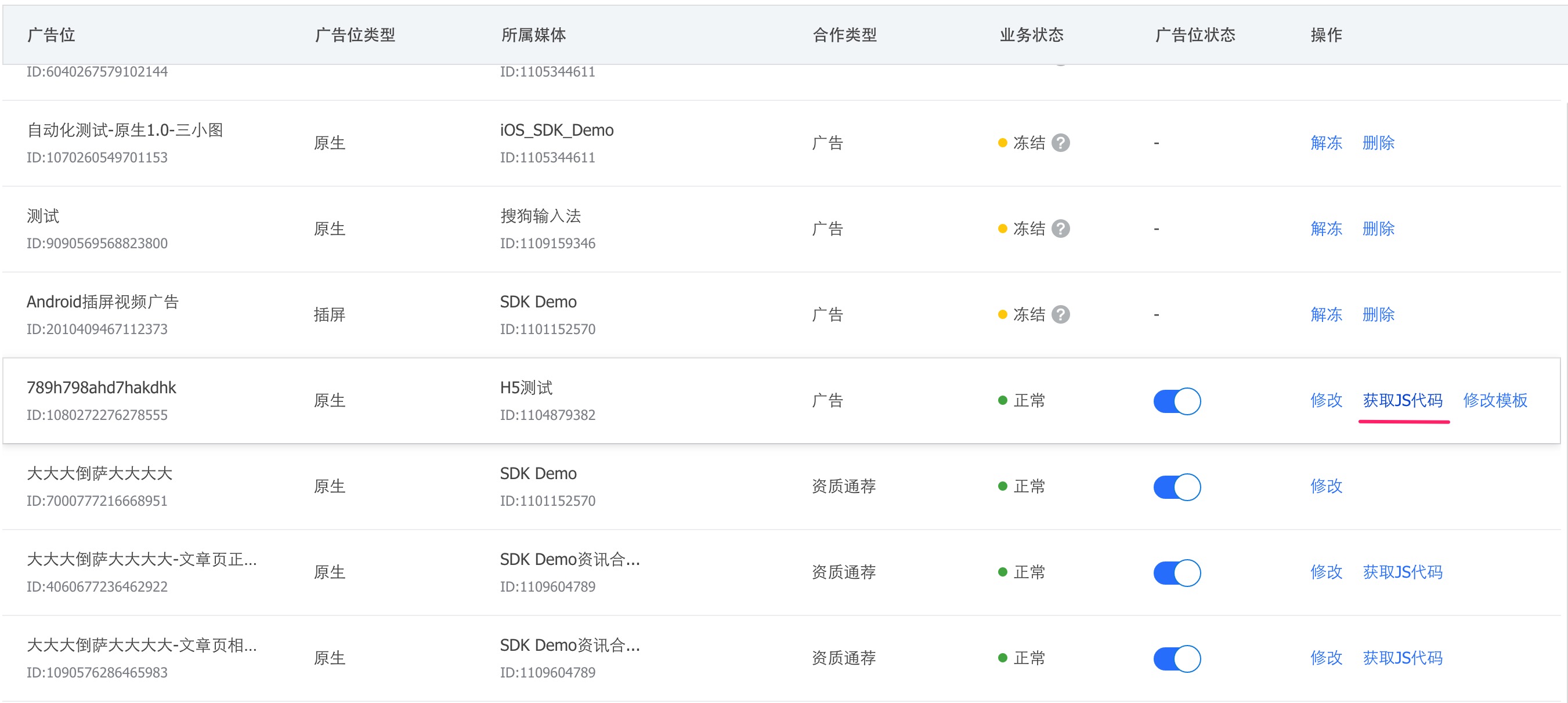 我的广告位 列表中,点击对应操作栏的H5广告,即可通过 获取JS代码 即可获取对应的示例代码,注意:示例代码中包含此广告的app_id和placement_id。
